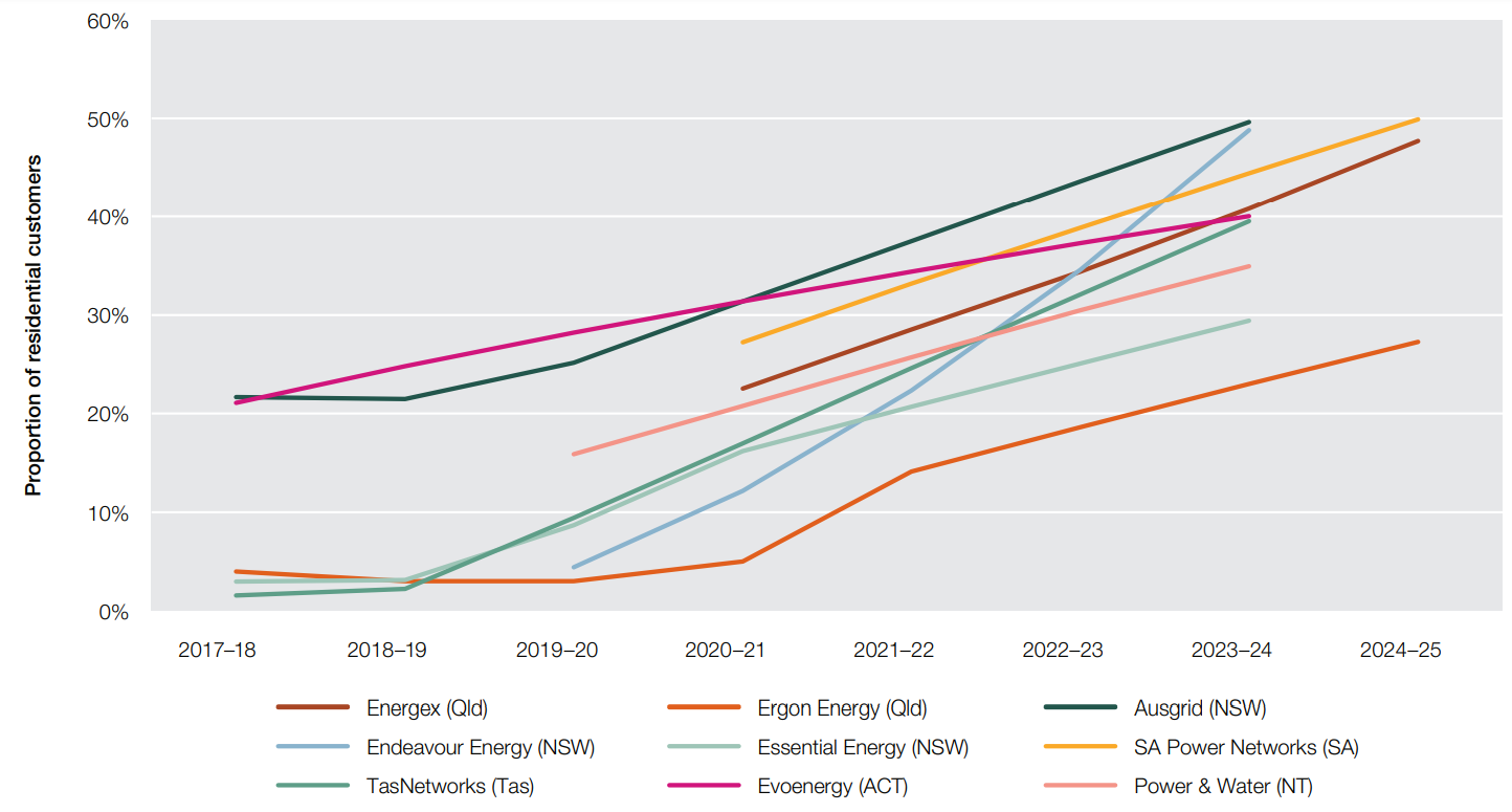 The State of the Energy Market report usefully reveals that DNSP forecasts expect increasing numbers of residential customers to be assigned cost-reflective network tariffs in contestable metering jurisdictions each year.