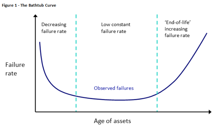 The bathtub curve is a good representation of how network assets deteriorate over time in electricity networks. Network engineering assets like substations, transformers and poles and wires often have a standard life expectancy of around 40 to 60 years[i].