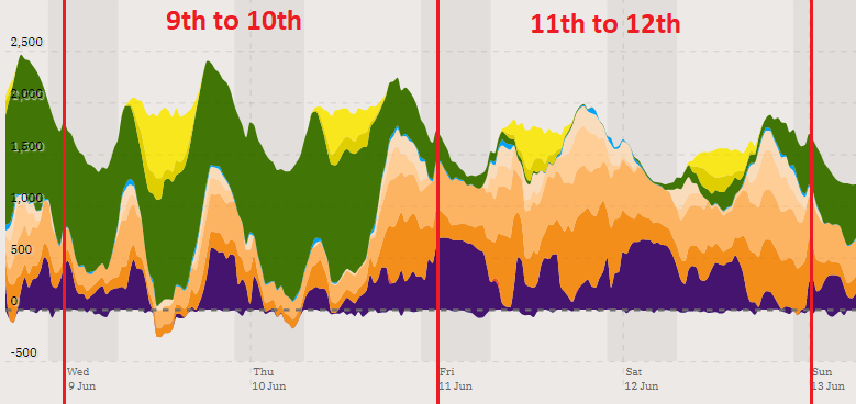 AEMO data (via Open NEM) shows that across 11 and 12 June, wind power (represented by green in Figure 1 below) generated fewer than 4,800 MWh of a total demanded 55,000 MWh, only 8.7 per cent of total generation. This is compared with 9 and 10 June when wind power generated 46,000 MWh out of a total demanded 73,000 MWh, contributing 63 per cent to generation.