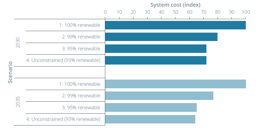 Figure 3 – Indexed systems cost for 2030 and 2035 – South Australia (Source: Frontier Economics (2021), Potential for gas-powered generation to support renewables)