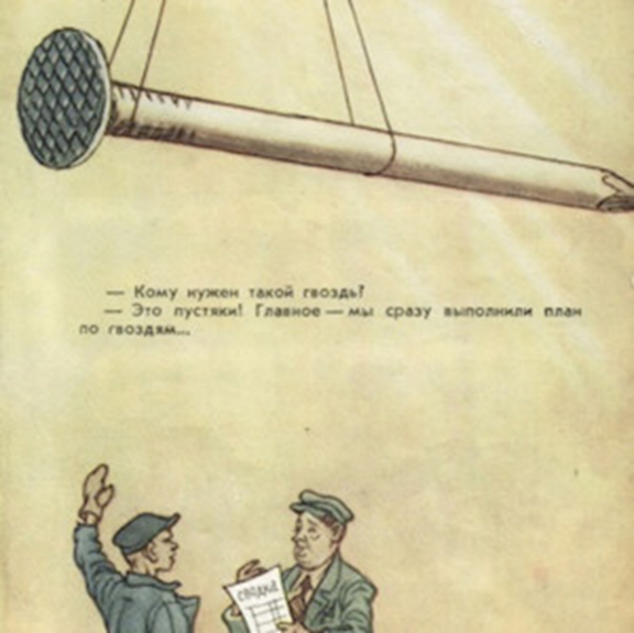 Using the wrong measure compounds the problem. This issue is best highlighted in a famous Soviet cartoon of a manager of a nail factory being awarded the Order of Lenin for exceeding his tonnage quota for nail production.