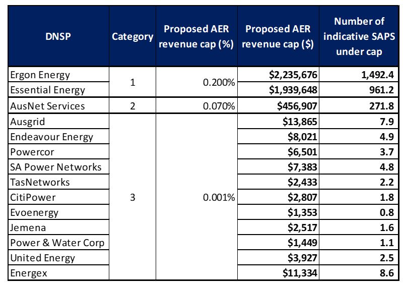 As shown in the table below, the proposed threshold for Category 3 distributors appears to allow for distributor-led SAPS indicative roll outs of between 0.8 to 8.6 SAPS in total without having to go through the AER’s waiver process.