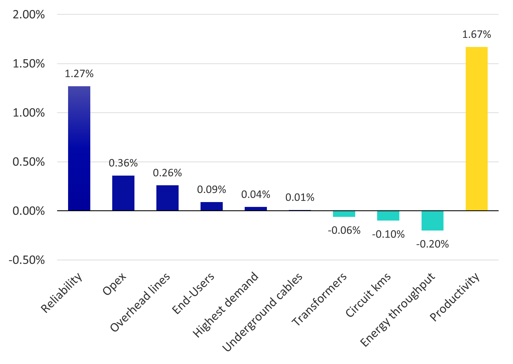 Transmission productivity improvements were led by higher reliability, recognised formally as lower unsupplied energy to customers. Smaller positive contributions to productivity were made by lower opex, fewer overhead lines and more customers.