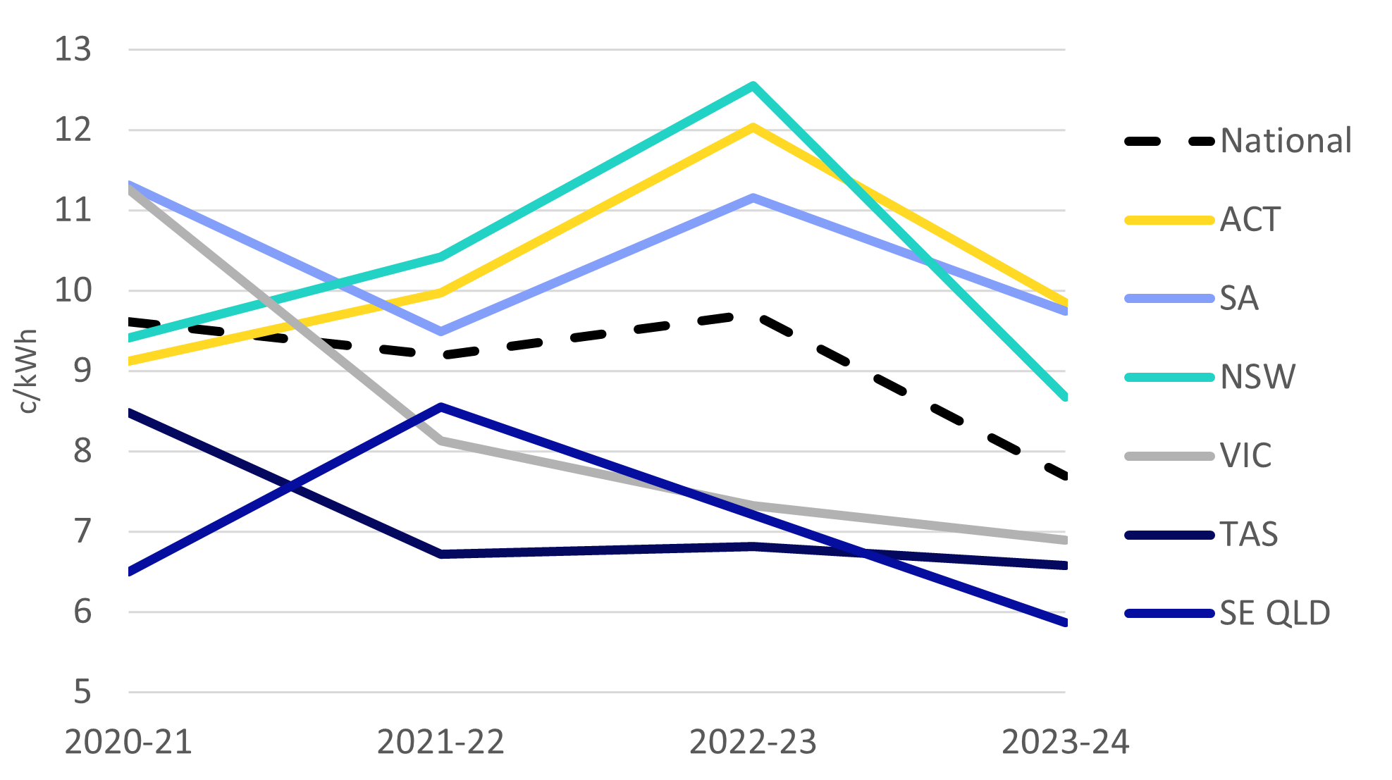 Environmental policies set by federal and jurisdictional governments are set to decline from 2021-22 onwards with the main driver being a higher supply of large-scale generation certificates, which is expected to reduce their price.