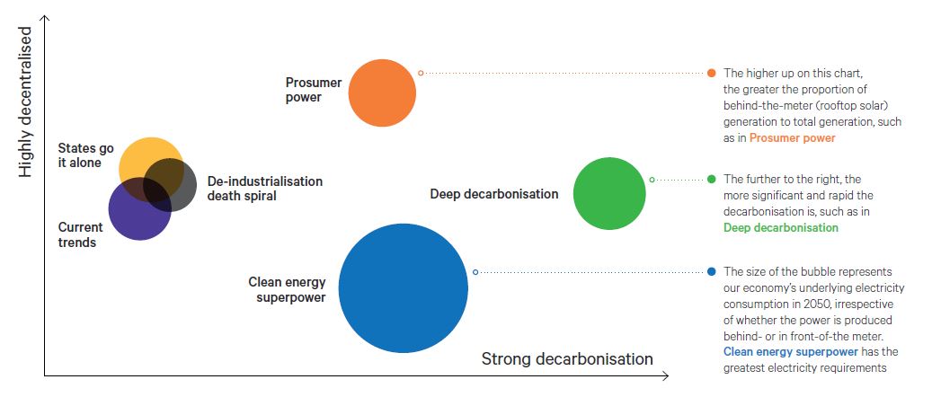 These scenarios consider current trends, states going it alone, de-industrialisation death spiral, prosumer power, deep decarbonisation and Australia as a clean energy superpower.