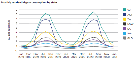 Figure 1: Monthly residential gas consumption by state (Source: Energy Networks Australia (2021), Reliable and clean gas for Australian households)