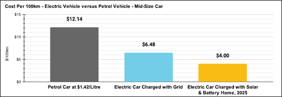- That this charging will reduce the fuel cost per 100 km from $12.14 for a petrol vehicle down to $4.00 based on electricity charged at homes with rooftop PV and a battery.