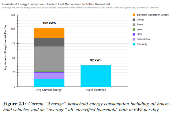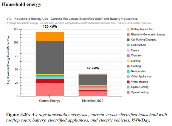 The research is based on an “average” energy consumption throughout the year. A detailed annual breakdown of energy usage by type and end use is provided in the report for each state. This is then electrified using assumption of efficiencies of heat pumps. For Victoria, this shows that a total energy requirement of 120 kWh can be replaced by 42 kWh when fully electrified.