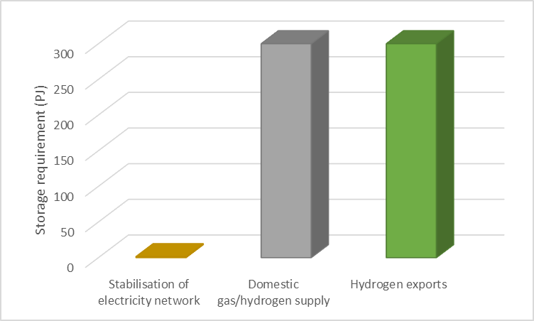 The scale of the storage challenges helps paint the picture. A total storage capacity of just over 600 PJ (about five million tonnes) was estimated. This was made up of 300 PJ for supporting the gas/hydrogen network, 300 PJ to support hydrogen exports and between 1.3 and 1.6 PJ[iii] of hydrogen to support the electricity network if hydrogen is used instead of batteries and/or pumped hydro.