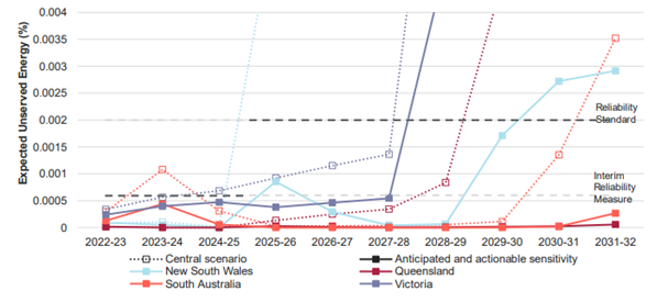 Fig 2 Reliability impact of projects that are well advanced but have not reached committed status, mainland NEM regions, 2022-23 to 2031-32[2]