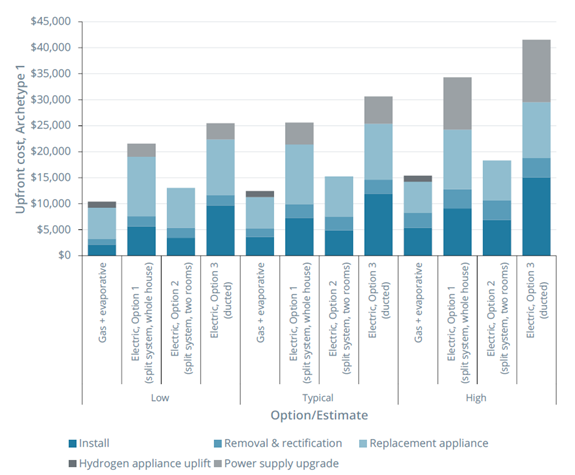 The findings of this analysis suggest the additional upfront cost to Victorian consumers of replacing their existing gas appliances with electric appliances, compared to replacing them with new gas appliances capable of burning hydrogen gas, varies significantly based on the level of amenity required. If all Victorian homes were to only attempt to heat and cool two major rooms of their home (Option 2), upfront costs for the state of electrification of households could be as low as $4 billion. This however provides less heating than homes have now. If, however, whole of home heating and cooling is required (Options 1 and 3), the cost is likely to increase to a figure in the region of $14 to $31 billion.
