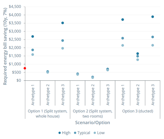 Given the wide range in cost estimates across the different archetypes and appliance options, the energy bills savings also vary widely. For reference, the estimated bill saving noted in Victoria’ Gas Substitution roadmap was $740 per year. This is shown by the red dot in Figure 4. The details of how those savings have been calculated are unclear but it is understood that a significant part of that relates to switching from ducted heating to only heating a few rooms in the home, and this loss of amenity would drive major energy and hence bill reductions. As can be seen from Figure 4, the average of required energy bill savings to justify the additional expense for electrification is much higher than the generous bill savings estimated in the VGSR.