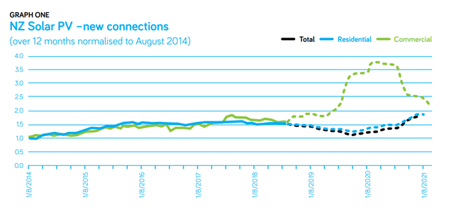 Figure 1 shows 12 months of new solar connections in NZ normalised to August 2014.