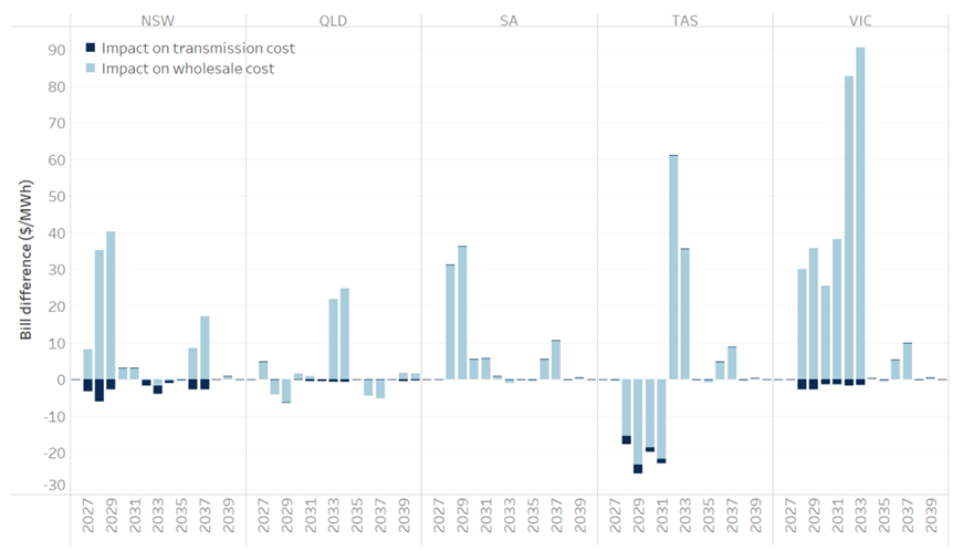 Figure 4 – change in wholesale and transmission cost ($/WMh, real $2022) from a two-year delay in transmission investment