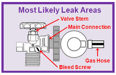 Figure 3: Illustration of most likely leak areas of a gas valve (Source Elgas: https://www.elgas.com.au/blog/505-bbq-gas-leak-test-gas-grill-barbecue/).