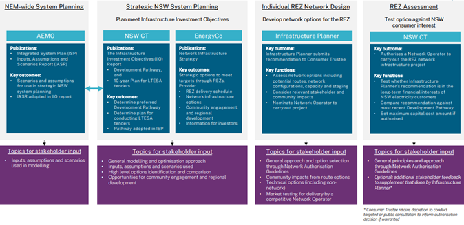 The NSW energy corporation, EnergyCo publishes a Network Infrastructure Strategy. The Infrastructure Planner, also EnergyCo, develops the network options (and non-network options), establishes the tender processes to deliver the project(s) and makes a recommendation(s) to the Consumer Trustee to authorise the project(s).
